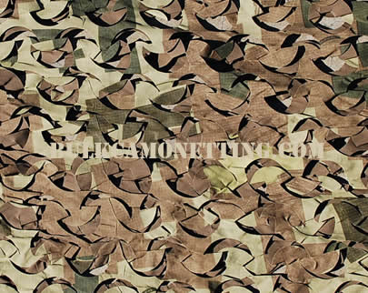 Printed Color Camo Netting Printed Color Camouflage nets have a camouflage pattern printed on one side of them. The other side is blank and usually a dull gray color. These camo nets rely on the print to create the color combination. Standard Color Camouflage NettingStandard Woodland Camouflage Netting - Green and Brown Standard Woodland Camo Netting is usually solid green on one side and solid brown on the other. You can place either the green or brown side up depending on which color you want shown more prominently. The green brown effect comes from the material's other side showing through the openings within the camo netting texture.